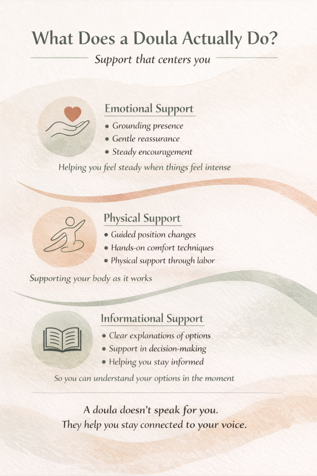 A doula does not take over your birth. They help you stay connected to your body, your preferences, and your voice.